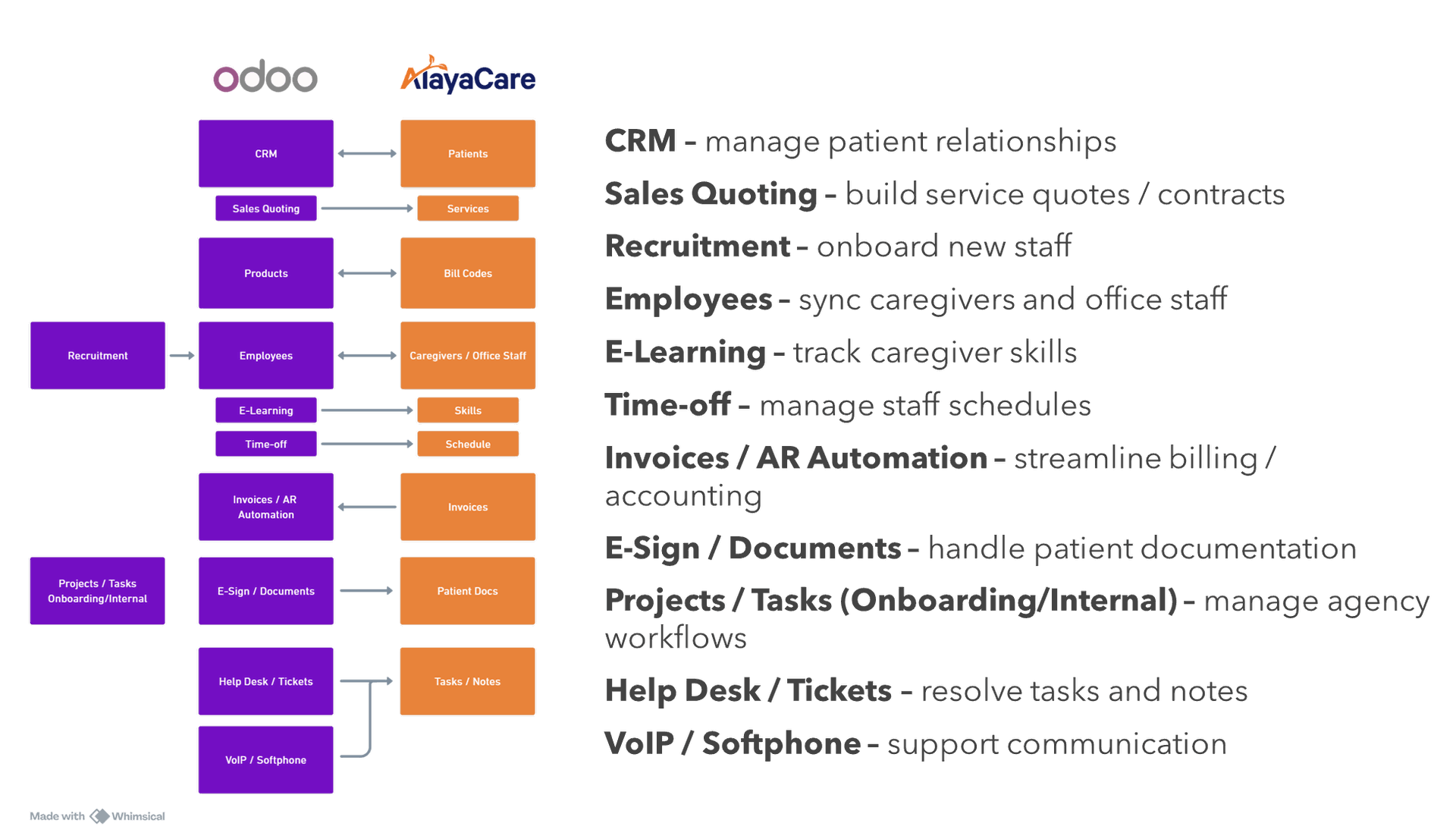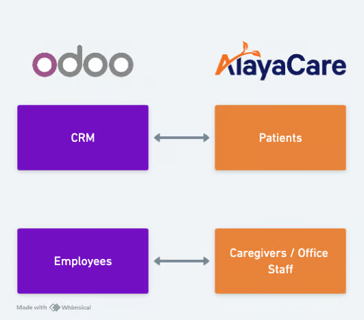 Our module syncs Caregivers, Staff, and Patients between AlayaCare and Odoo CRM/Employees, with the option to make Odoo the source of truth.